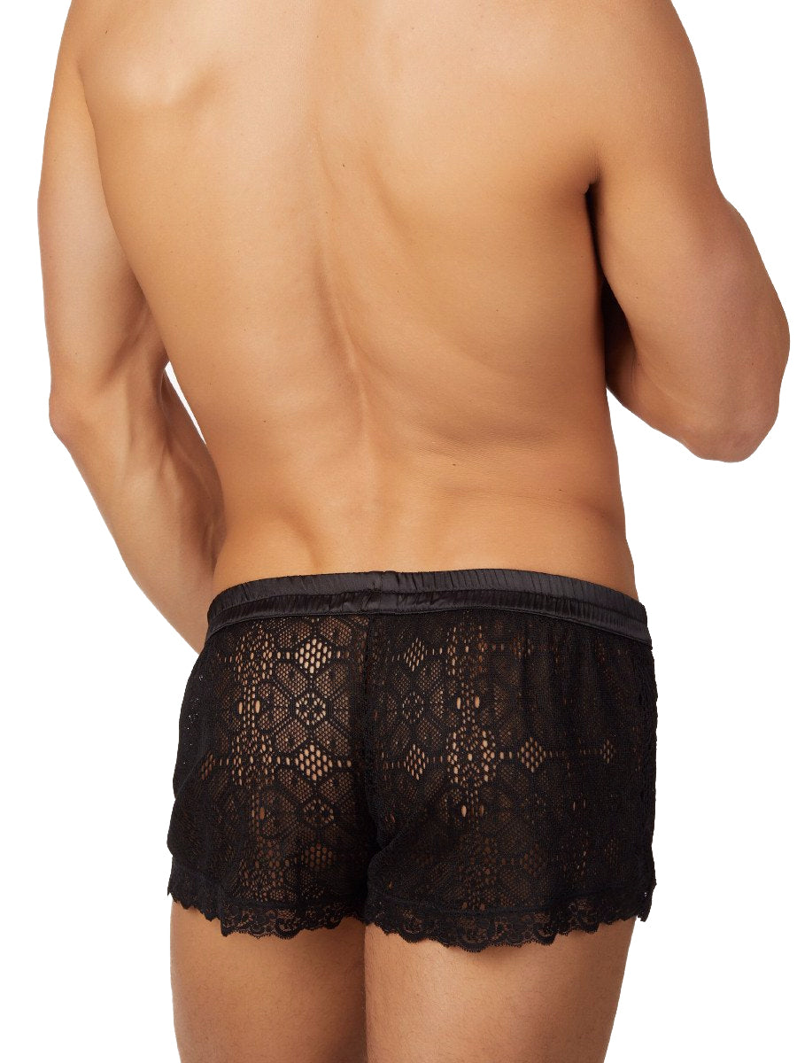 Lightweight crochet lace fabric meets shiny satin in this soft square-cut shorty for men . Featuring a comfortable shiny satin waistband that sits perfectly just above the hip and trimmed in scalloped lace, this shorty has a minimal inseam to give your legs lots of length. Side-slits on each leg. Slightly stretchy crochet lace fabric is smooth, sleek and slightly see-through. With a center seam in the front and back for maximum sculpting!