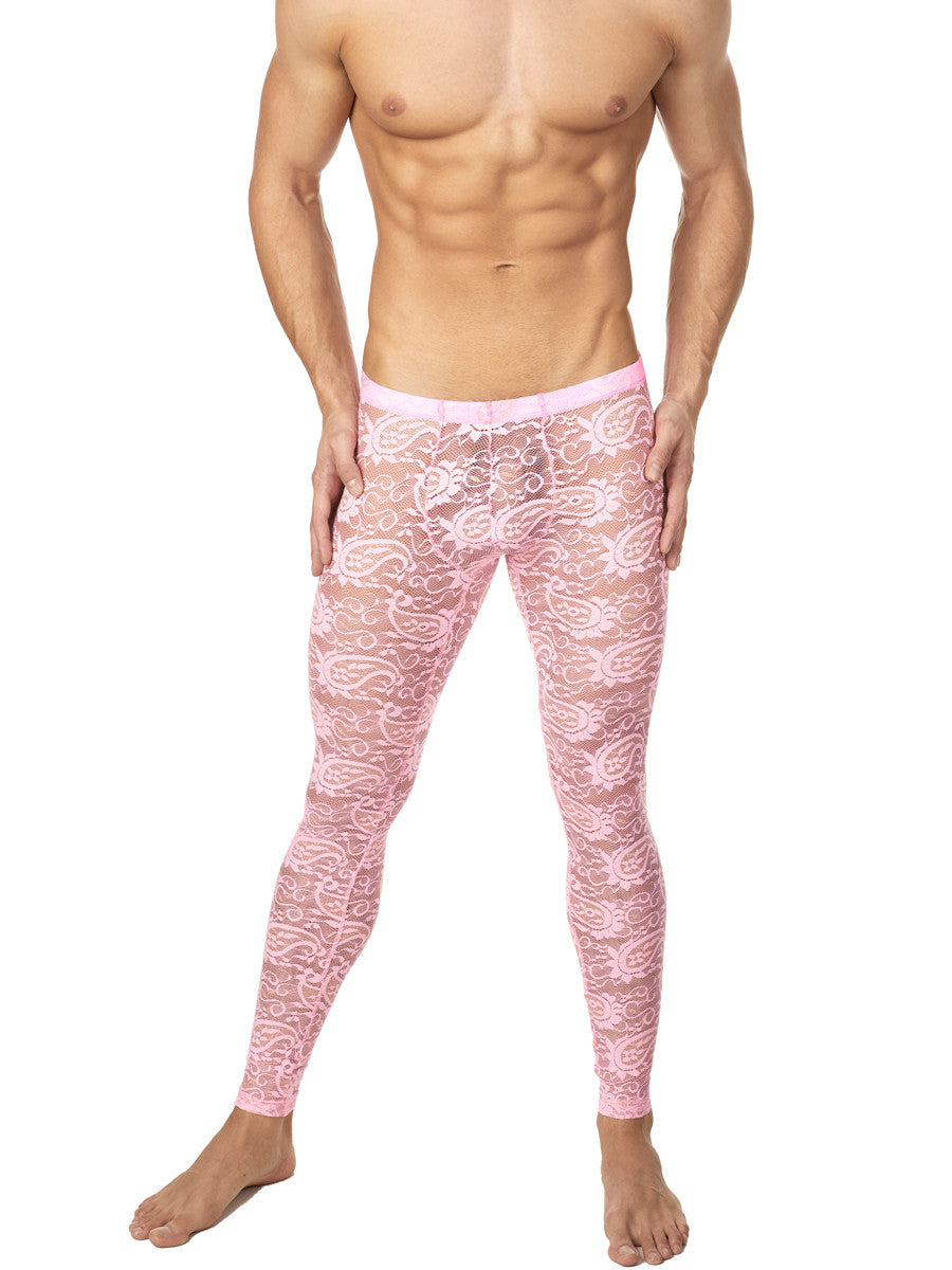 Soft lace is engineered into a sleek and form-fitting legging for men. The stretch lace is embroidered with a paisley design and features metallic thread that gives a subtle gleam with every turn. A soft elastic waistband sits comfortably at the hips, and a three-seam contouring pouch front that provides support yet allows room for the boys. Center seam down the back.