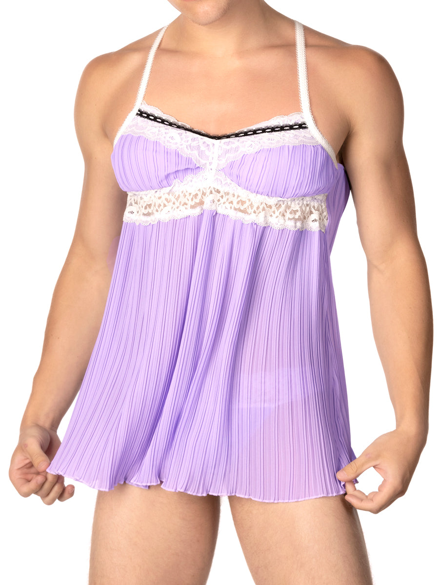 Our most vibrant and flirty babydoll for guys! Made from semi-see-thru chiffon fabric with vertical pleats for a delicate and flowing silhouette. Lace trim at the bustline and a gathered lace panel for the underbust. Also includes removable foam inserts. The adjustable straps are made from sturdy and stretchy picot edge elastic forming a criss-cross shape at the back so the straps never slip! The matching g-string is made from the same material as the nightie forming the perfect pouch for your goods and a contrasting white lace waistband. The babydoll and panty are sold together as a set.
