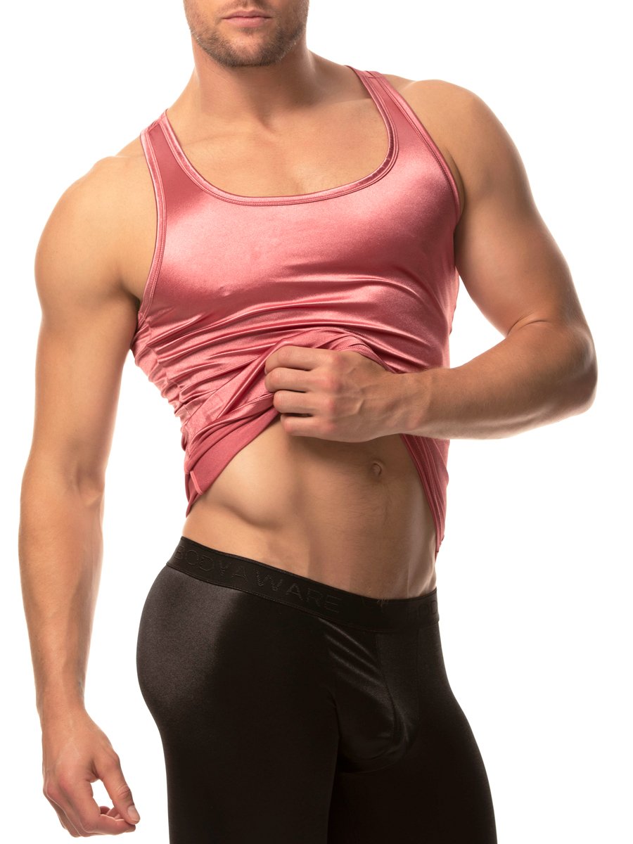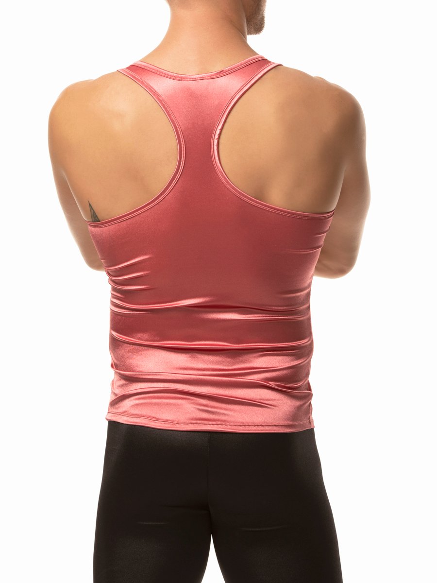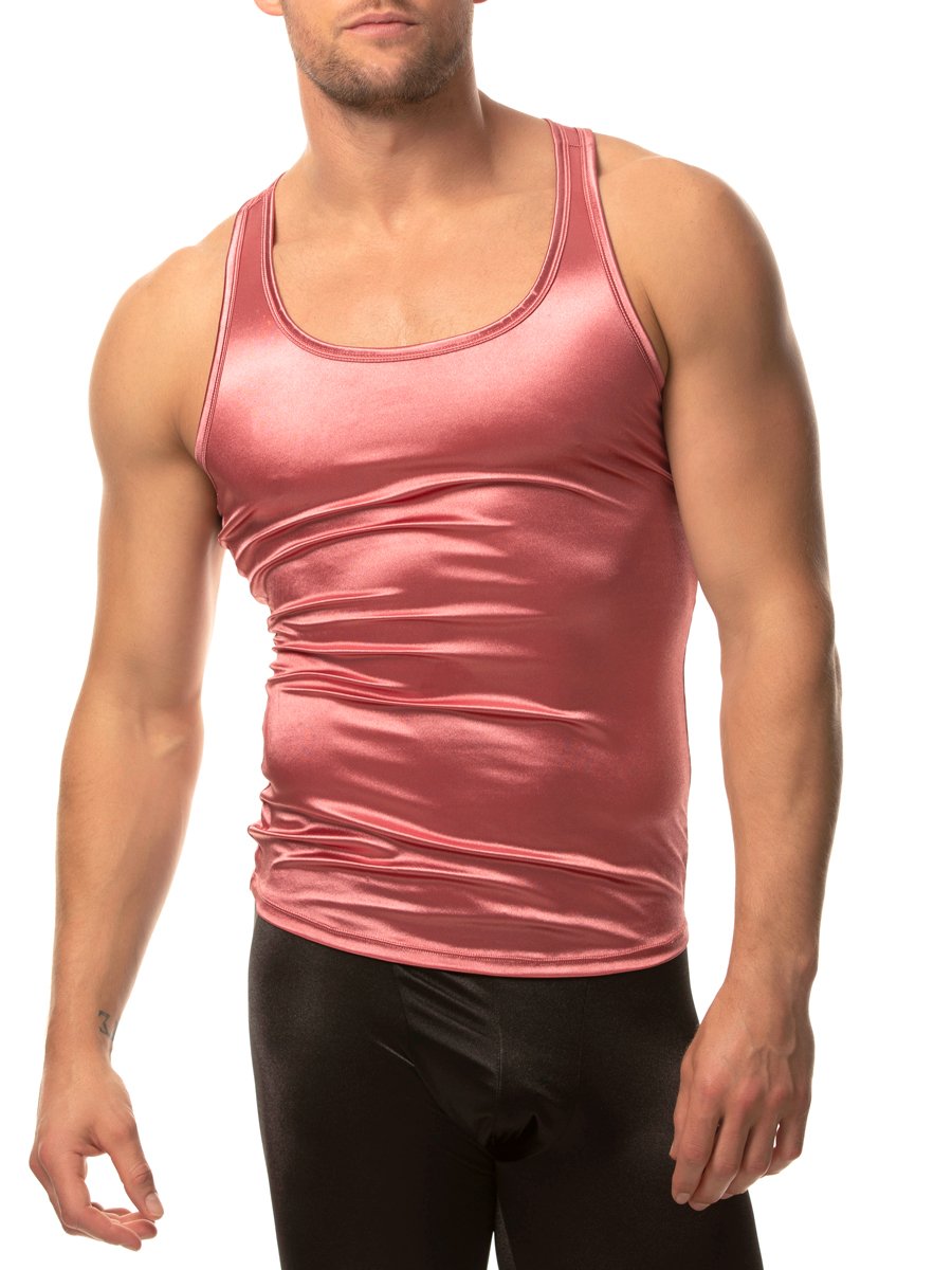 Soft, stretchy, and very shiny mirror satin is featured in the Smooth Satin Tank. This handsome satin tank top is tailored to fit your physique to perfection. Athletic-styled back.