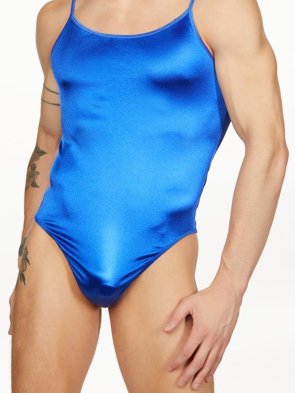 A sophisticated thong bodysuit suitable for any event. Crafted from sleek, shimmering stretch satin, this garment features a scoop neckline and deep scoop back. Bound in stretchy elastic, it boasts two adjustable straps for optimal fit. The thong back is designed with a high leg cut and roomy gathered front, with no snaps between the legs.