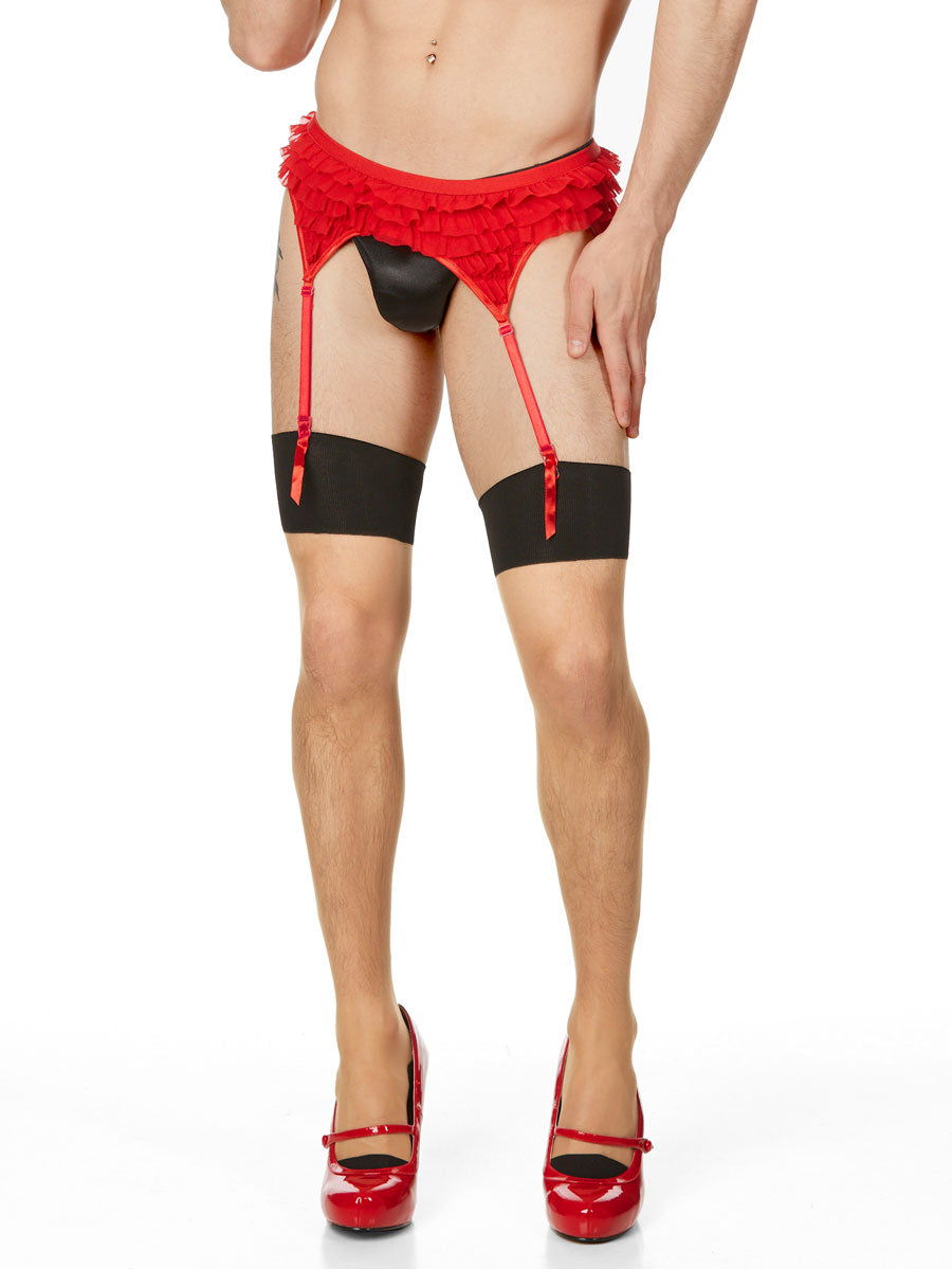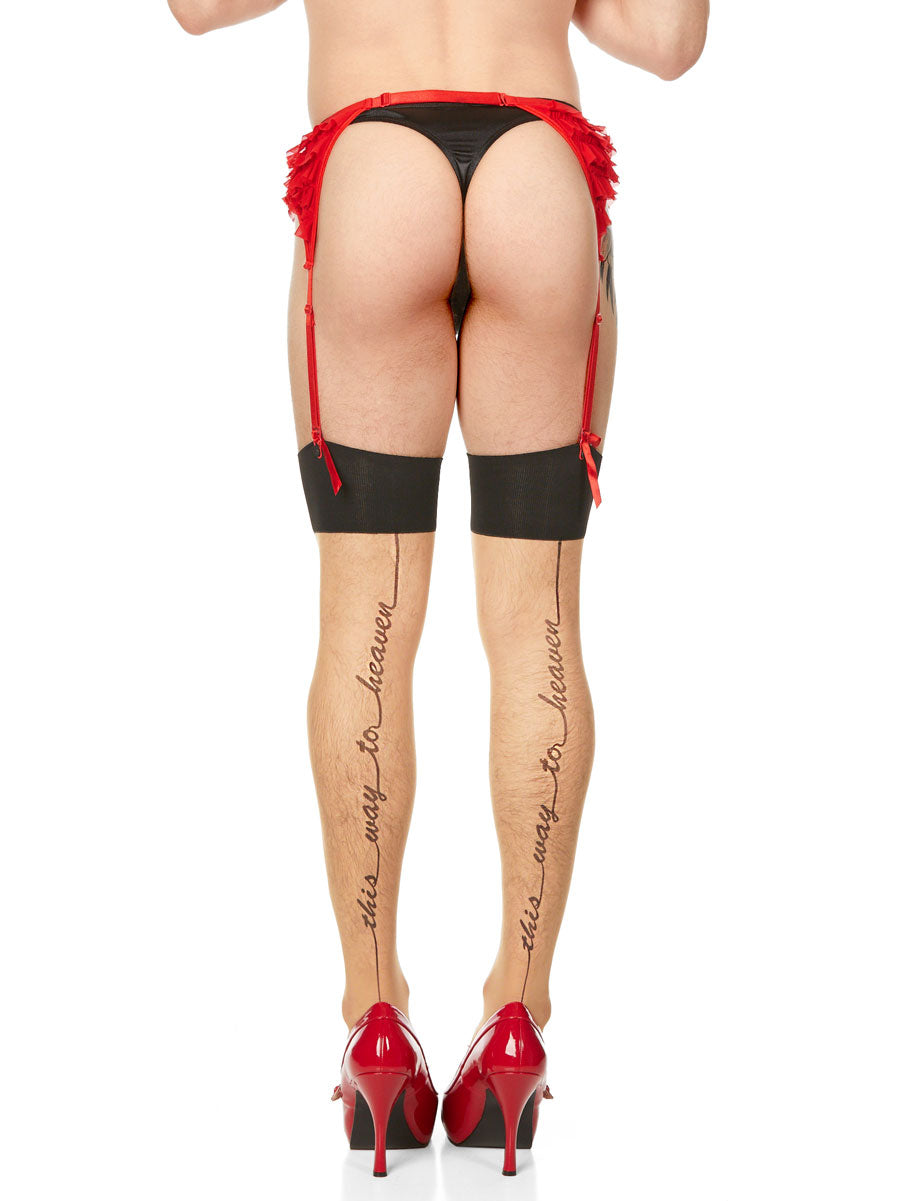 Let your stockings do the talking with these classy nude and black back seam stockings for guys. Scriptwriting on the back seam says "This way to heaven." May be worn with garters to keep stockings held up on the thigh.