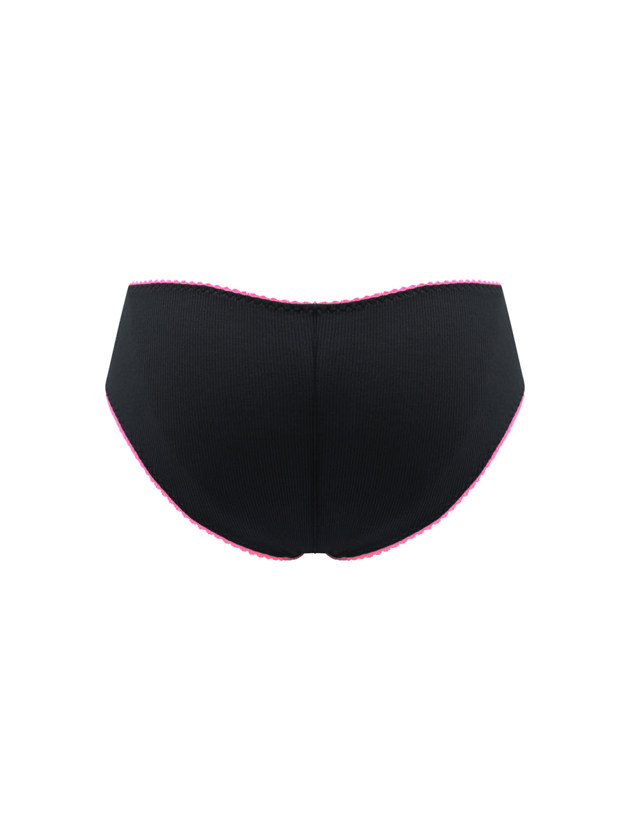 A sultry mini panty that brings a playful twist to everyday indulgence. Crafted in breathable black fabric with a baby ribbed texture, it's soft and lightweight against the skin, with just the right amount of feminine flair. Pink picot trim dances along the waist and leg openings, and continues along dainty vertical seams that trace the hips for a delicate finish. A seamless front keeps things smooth and comfy, while the single back seam provides a gentle contour for your curves.